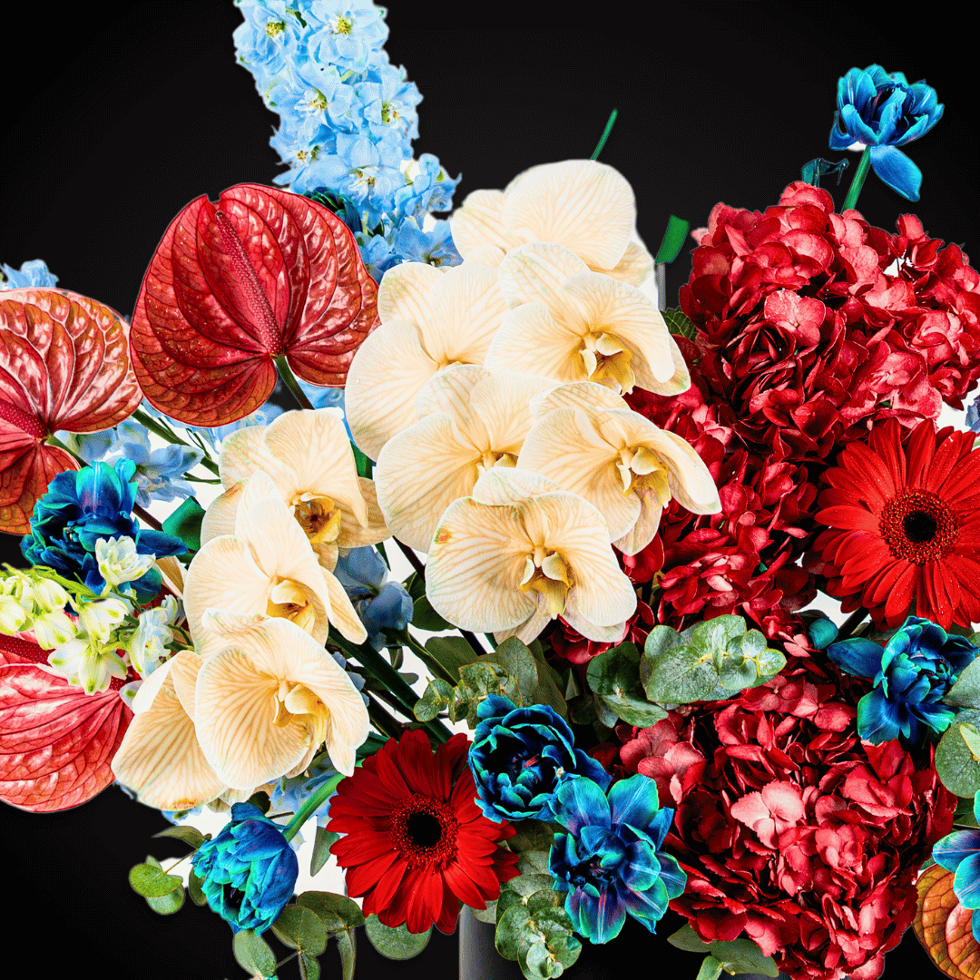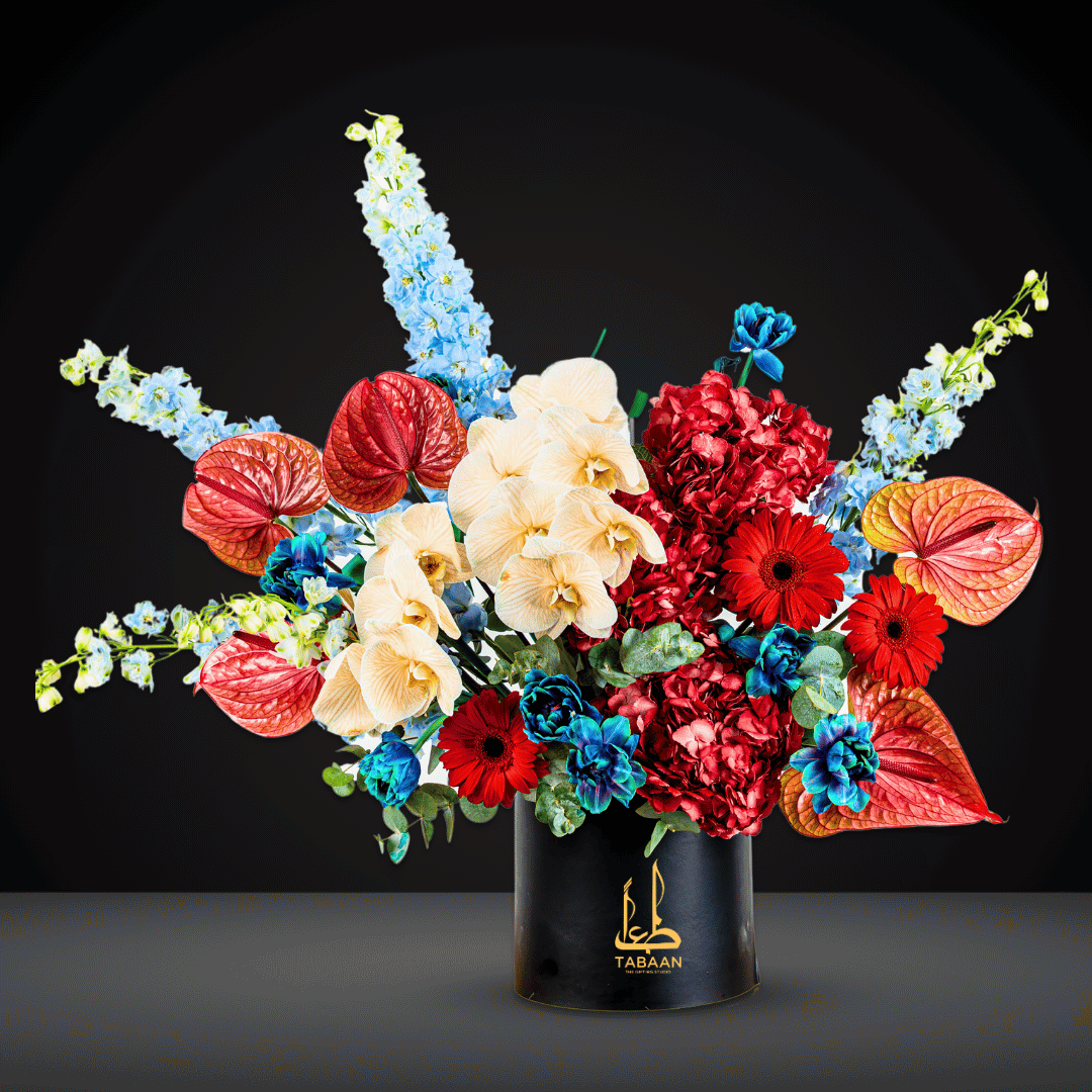 A bold and artistic masterpiece, Blue Ruby captivates with its striking mix of deep blue, rich red, and soft ivory flowers, elegantly arranged in a luxurious black TABAAN box. This vibrant arrangement embodies passion and elegance, making it the perfect statement gift for any special occasion. (The image showcases the large arrangement.)
