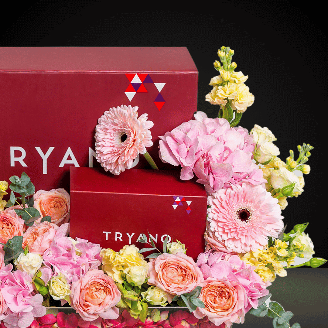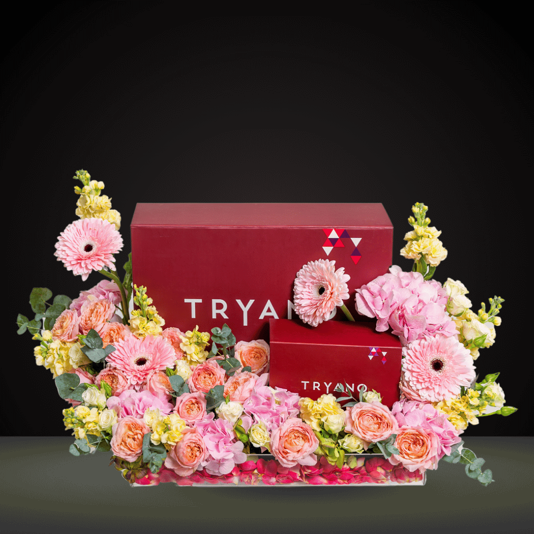 A perfect harmony of elegance and luxury, Blush Bliss features a stunning arrangement of pink flowers in a sleek acrylic tray, paired with our exclusive gifting concierge service to select the perfect TRYANO gift on your behalf. (The gift shown in the product image is for showcase purposes only and not included in the package price.) 💕🎀