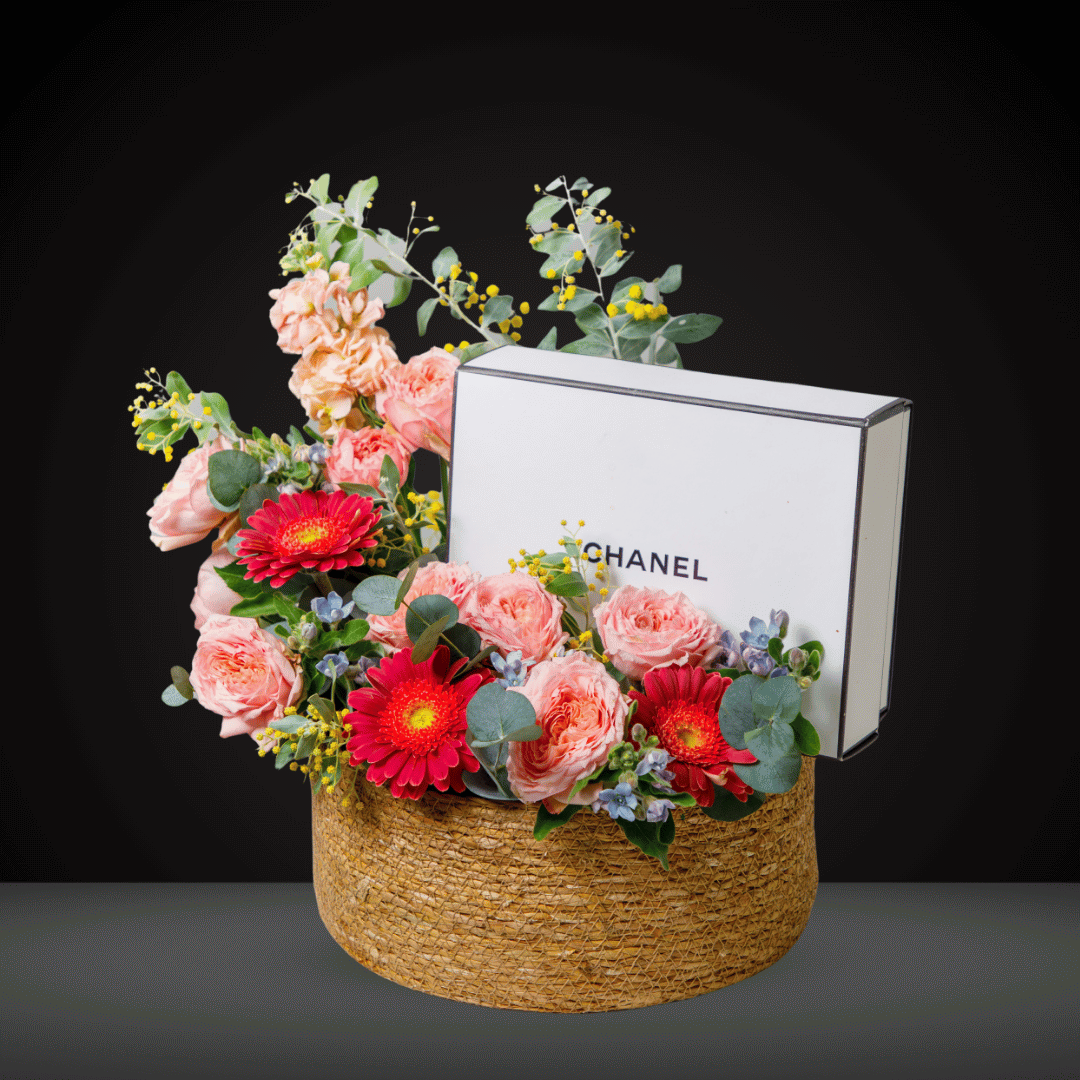 A perfect blend of passion and grace, Blush & Scarlet features a stunning arrangement of red and pink flowers in an elegant basket, paired with our exclusive gifting concierge service to select the perfect Chanel gift on your behalf. (The gift shown in the product image is for showcase purposes only and not included in the package price.)