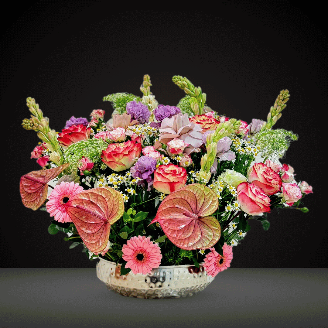 A breathtaking blend of pink wildflowers, roses, and a vibrant mix of blooms, Wildflower Magic brings nature’s beauty to life in a stunning display. Bursting with color and charm, this arrangement is perfect for making a bold, unforgettable statement. (The image showcases the large arrangement.)